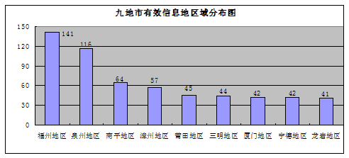 592件有(yǒu)效信(xin)息事項(xiang)地域(yu)分(fēn)布,福州地區(qu)141件,泉州地區(qu)116件,南(nan)平地區(qu)64件,漳州地區(qu)57件,莆田地區(qu)45件,三明地區(qu)44件,廈們(men)地區(qu)42件,寧(ning)德(dé)地區(qu)42件,龍岩地區(qu)41件。
