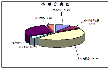 592件有(yǒu)效信(xin)息按事項(xiang)類别劃分(fēn),供電(dian)服務(wu)274件,占46.28%;市(shi)場(chang)準入53件,占8.95%;成(cheng)本(ben)與價格收費41件,占6.93%;電(dian)力(li)安(an)全29件,占4.9%;非(fei)電(dian)能(néng)源26件,占4.4%;其它事項(xiang)169件,占30%。